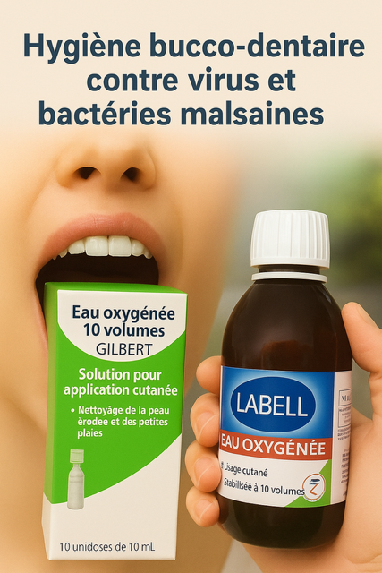 - Mettre 1 dose de 10 ml d'eau oxygénée dans un verre d'eau et se rebrosser les dents avec ce mélange